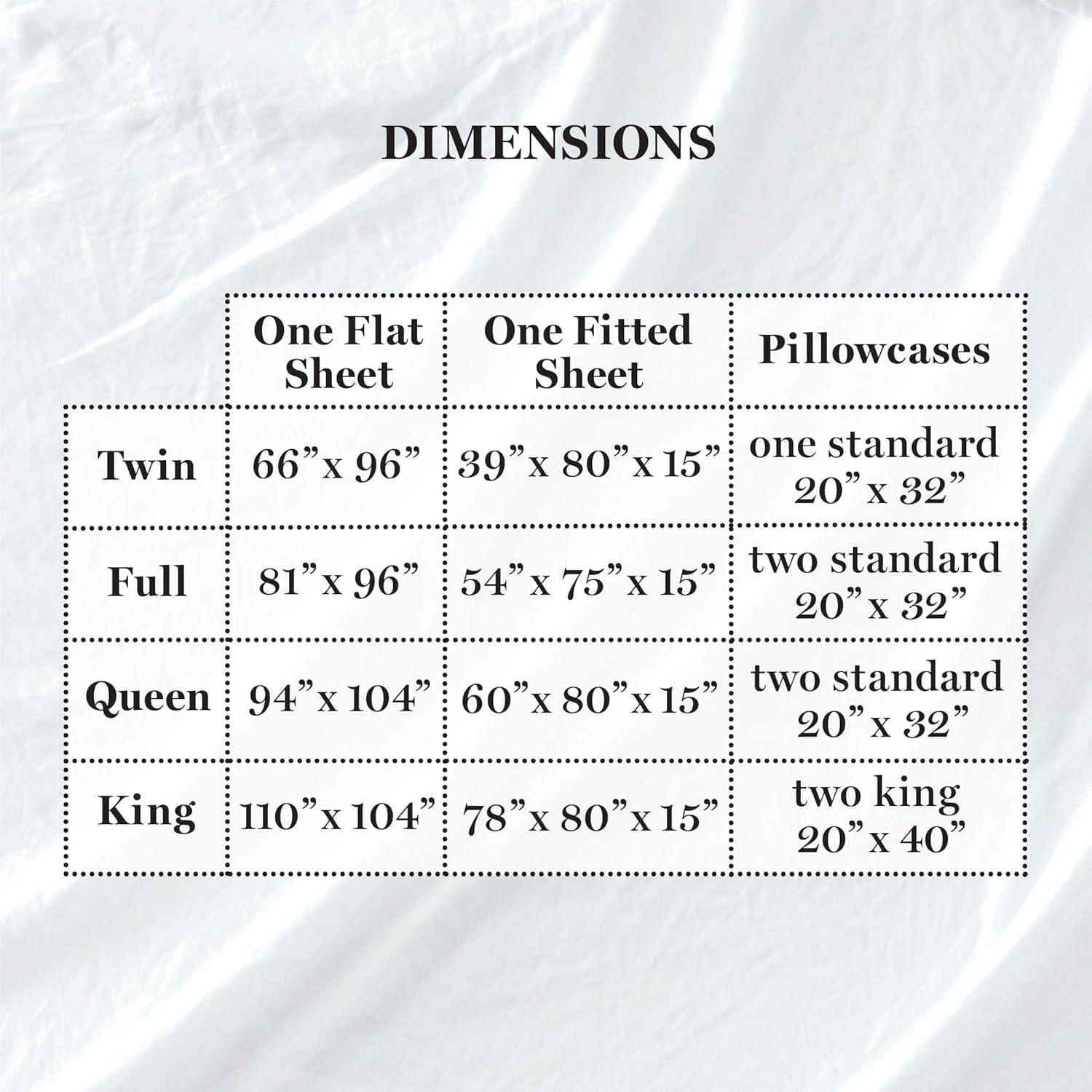 Queen Sheet Set Includes: 1 Flat Sheet (94in x 104in), 1 Fitted Sheet (60in x 80in x 15in), 2 Standard Pillowcases (20in x 32in)