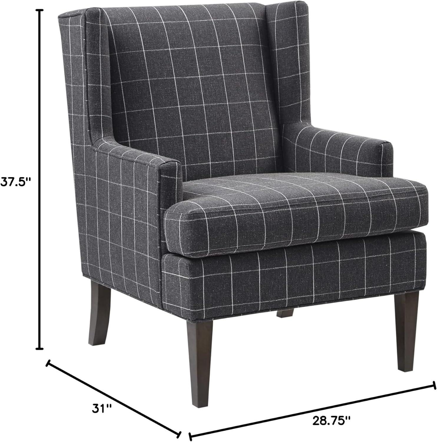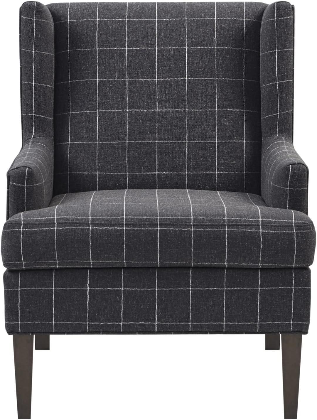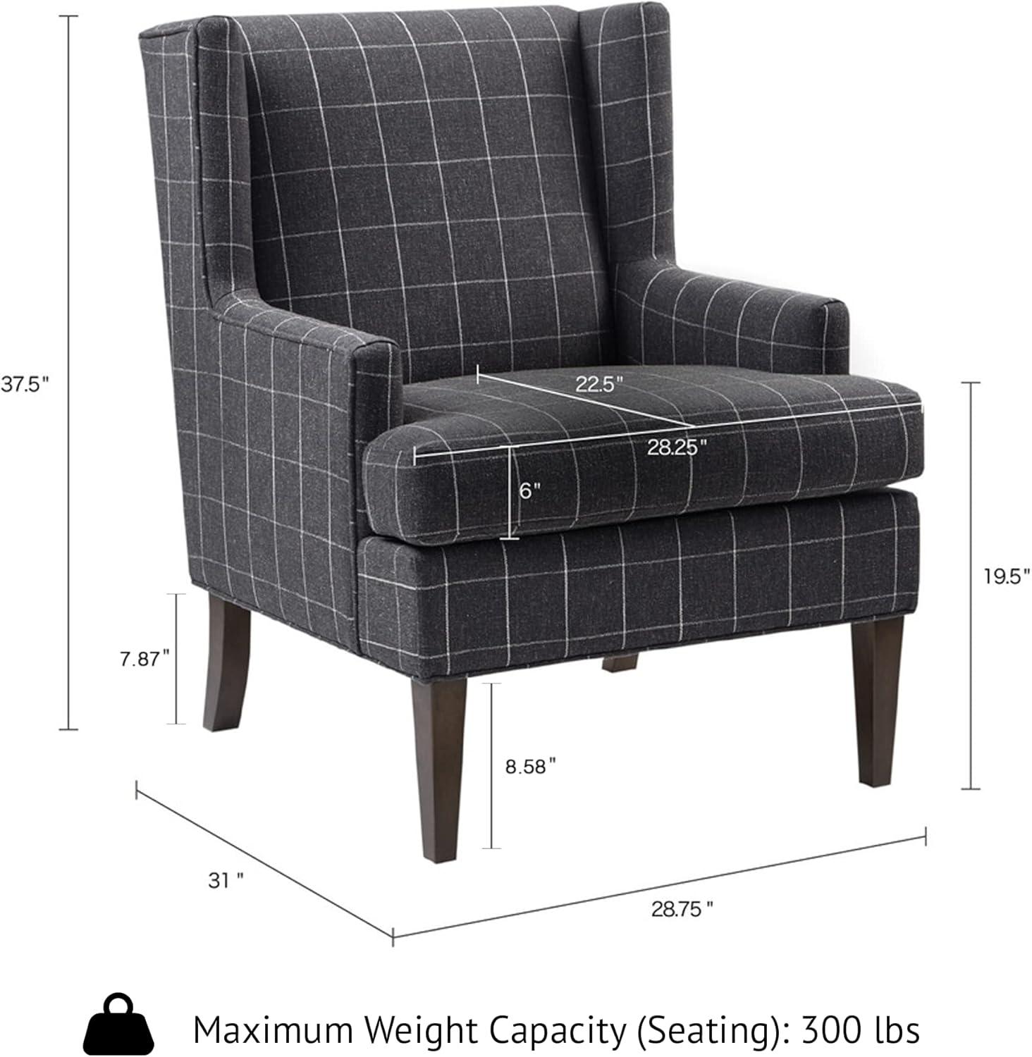 Bring timeless comfort and refined design to your space with the Decker Accent Chair from Martha Stewart’s Bedford Collection. This farmhouse-inspired chair features a classic wingback silhouette with clean lines and panel arms for a polished yet relaxed look. Upholstered in a windowpane plaid fabric for subtle texture and tailored charm. The removable T-shaped seat cushion fits neatly around the arms, extends slightly for added comfort, and is easy to clean and maintain. A sturdy wood frame and elevated base with tapered legs complete the look. Easy to assemble. Add this versatile piece to your home today.