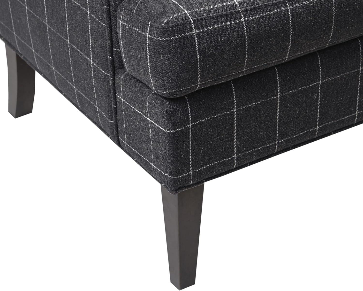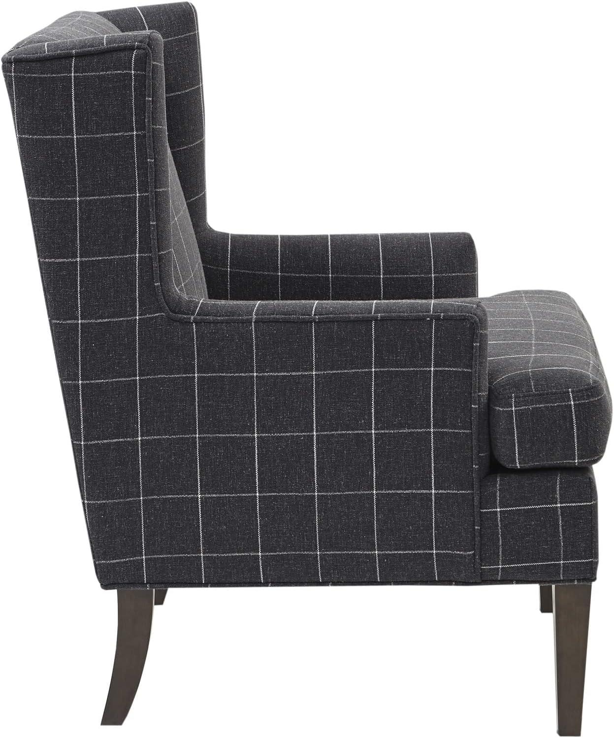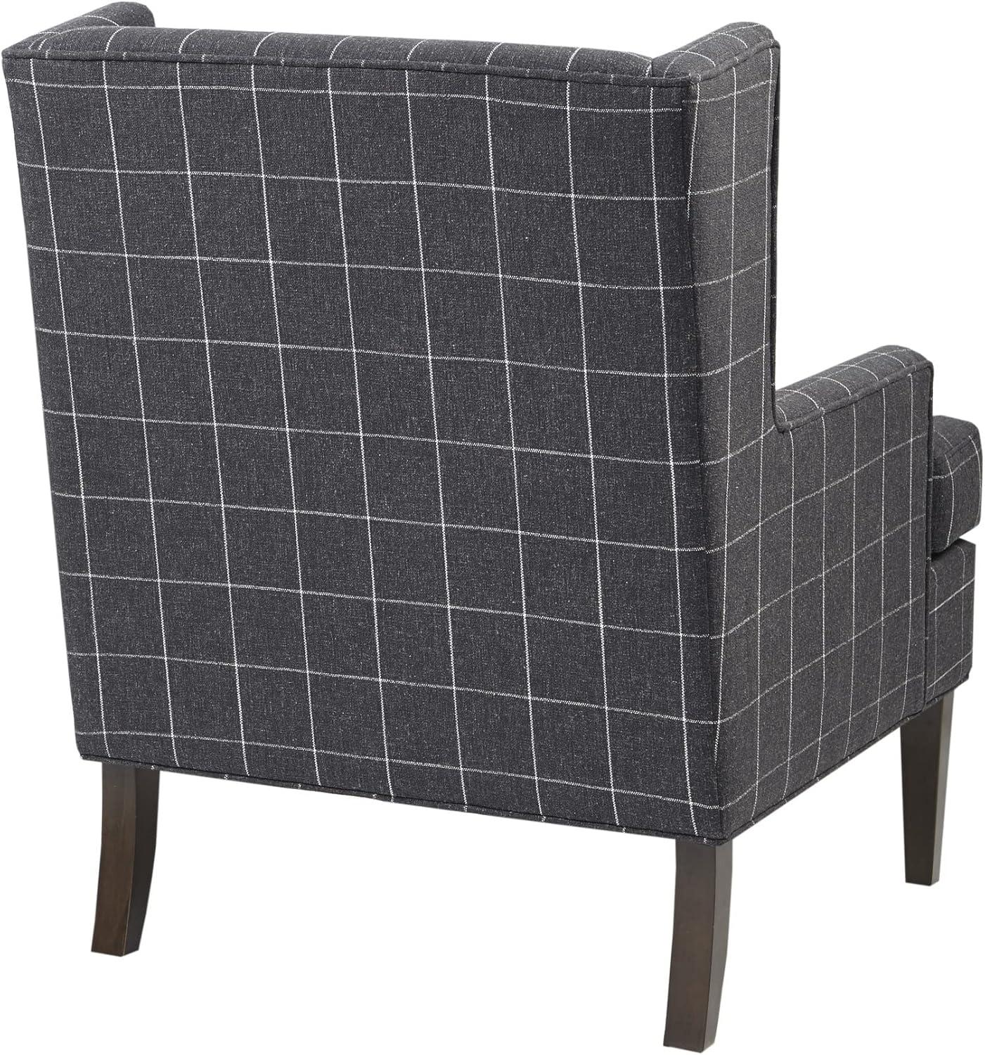 Bring timeless comfort and refined design to your space with the Decker Accent Chair from Martha Stewart’s Bedford Collection. This farmhouse-inspired chair features a classic wingback silhouette with clean lines and panel arms for a polished yet relaxed look. Upholstered in a windowpane plaid fabric for subtle texture and tailored charm. The removable T-shaped seat cushion fits neatly around the arms, extends slightly for added comfort, and is easy to clean and maintain. A sturdy wood frame and elevated base with tapered legs complete the look. Easy to assemble. Add this versatile piece to your home today.