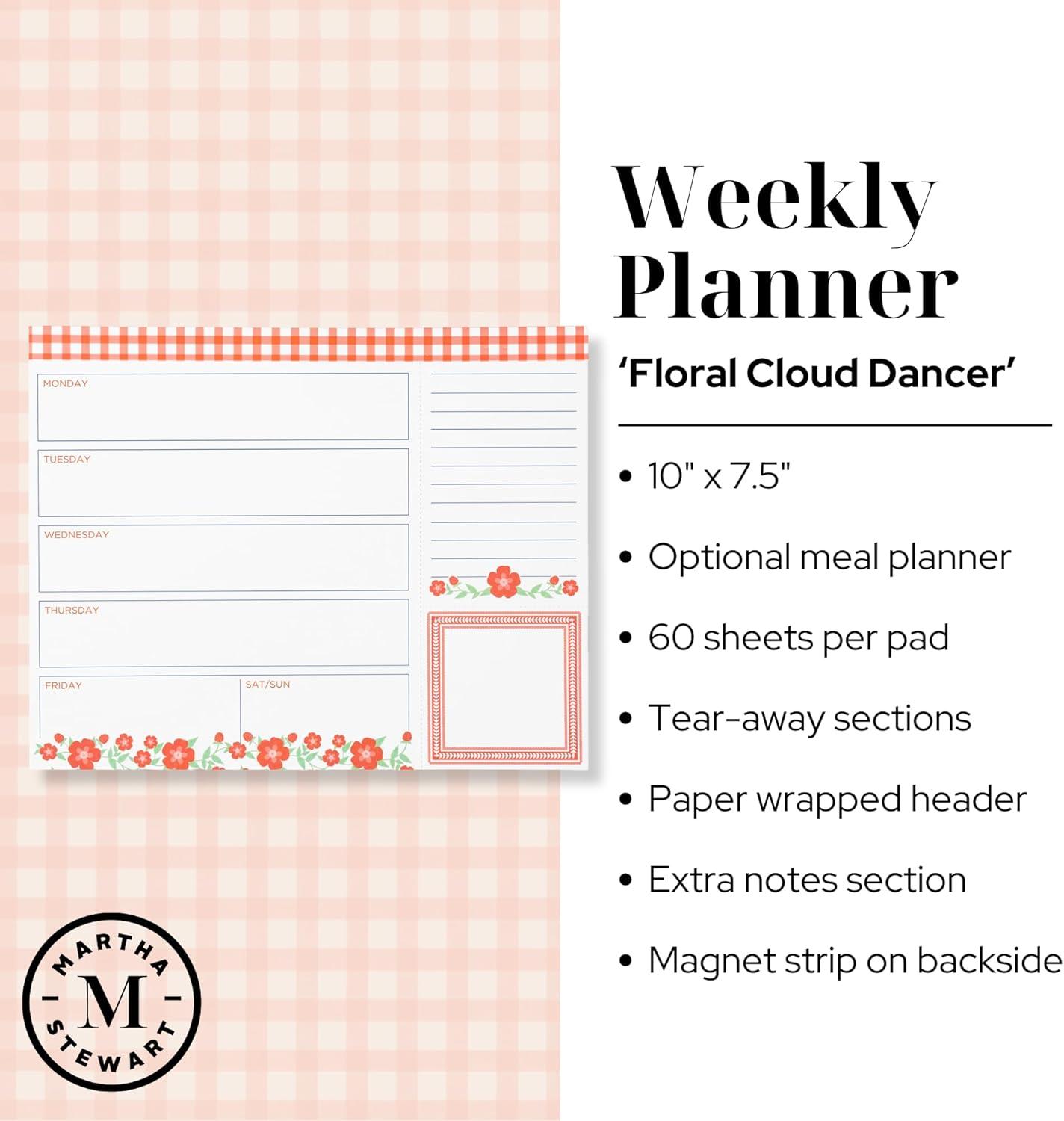Martha Stewart Weekly Planner Notepad, Grocery List Notepad with Daily Sections, 10″ x 8″ Undated Desk Planner for Women, Magnetic Backing, Floral Cloud Dancer