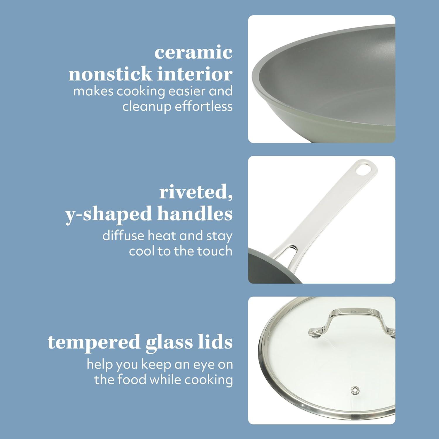 The ceramic nonstick interior proves that healthier cooking doesn’t have to be boring. Made without PFOA, PTFE, lead, or cadmium, the nonstick surface features an easy-release design that prevents food from sticking—without the need for added oil or fat. Stainless steel handles feature a Y-shaped design to help dissipate heat and stay cool to the touch. Each pot comes with a tempered glass lid to retain heat and moisture while allowing visibility to monitor food as it cooks. Induction-compatible and oven-safe up to 500°F (350°F with glass lids). Hand wash recommended.