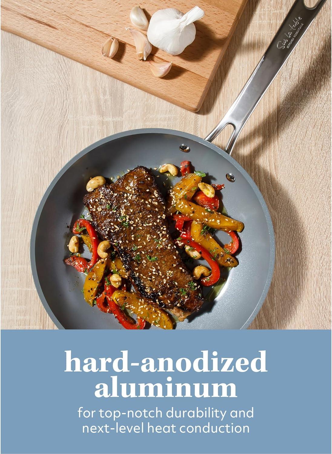 More than the delicious flavors in any dish, it’s the communal experience of dining that makes a recipe truly unforgettable. As family and friends gather around the table, sharing memories over a spread of sides, mains, and desserts becomes the highlight of any get-together. The Cool Commune Ceramic Nonstick Hard-Anodized Aluminum Cookware Collection is inspired by the joy and togetherness of dining and entertaining. This suite of forged, hard-anodized aluminum pots and pans emphasizes durability for everyday cooking. Hard-anodized aluminum is tougher than traditional aluminum, making it resilient enough to withstand the demands of daily use. Whether you’re enjoying a leisurely cooking experience or preparing a meal in a fast-paced setting, this cookware set ensures even cooking every time.
