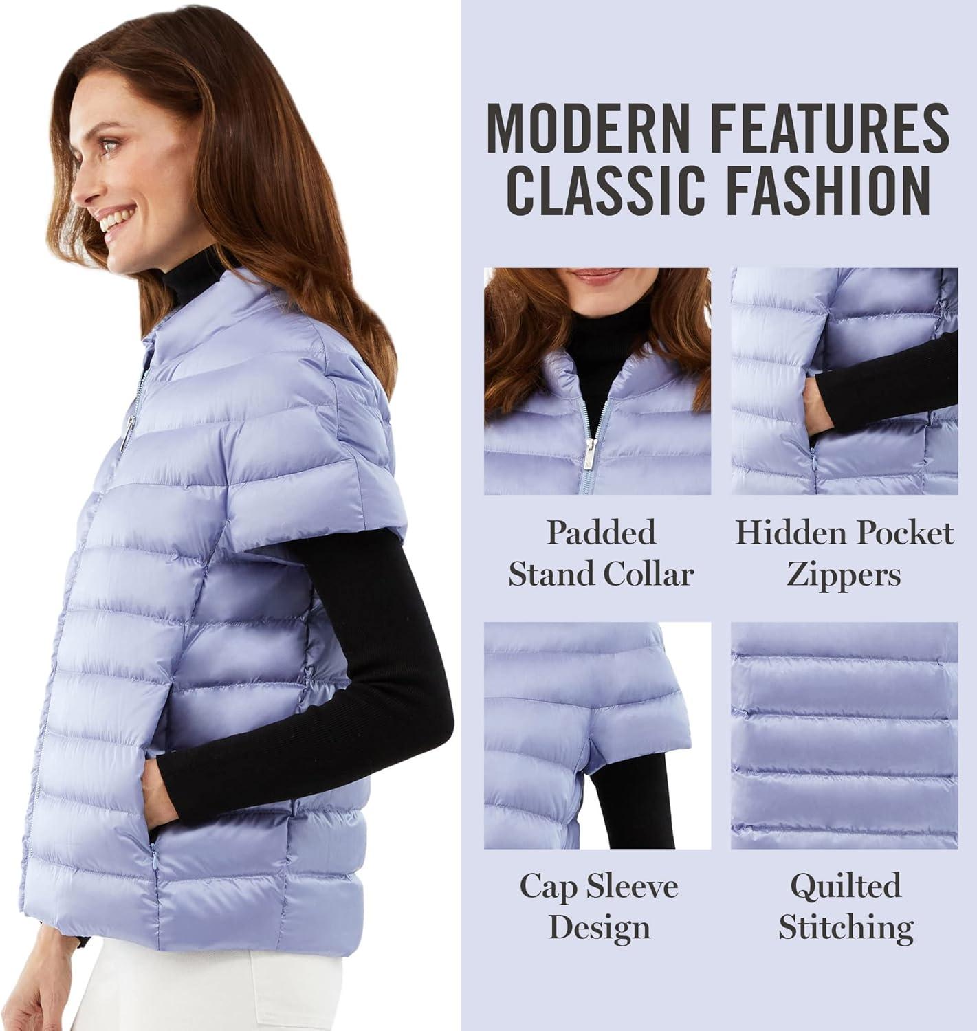 Martha Stewart Women’s Quilted Down Puffer Vest, Lightweight Short Sleeve Packable Jacket with Pockets, Warm Winter Outerwear(Bellflower)