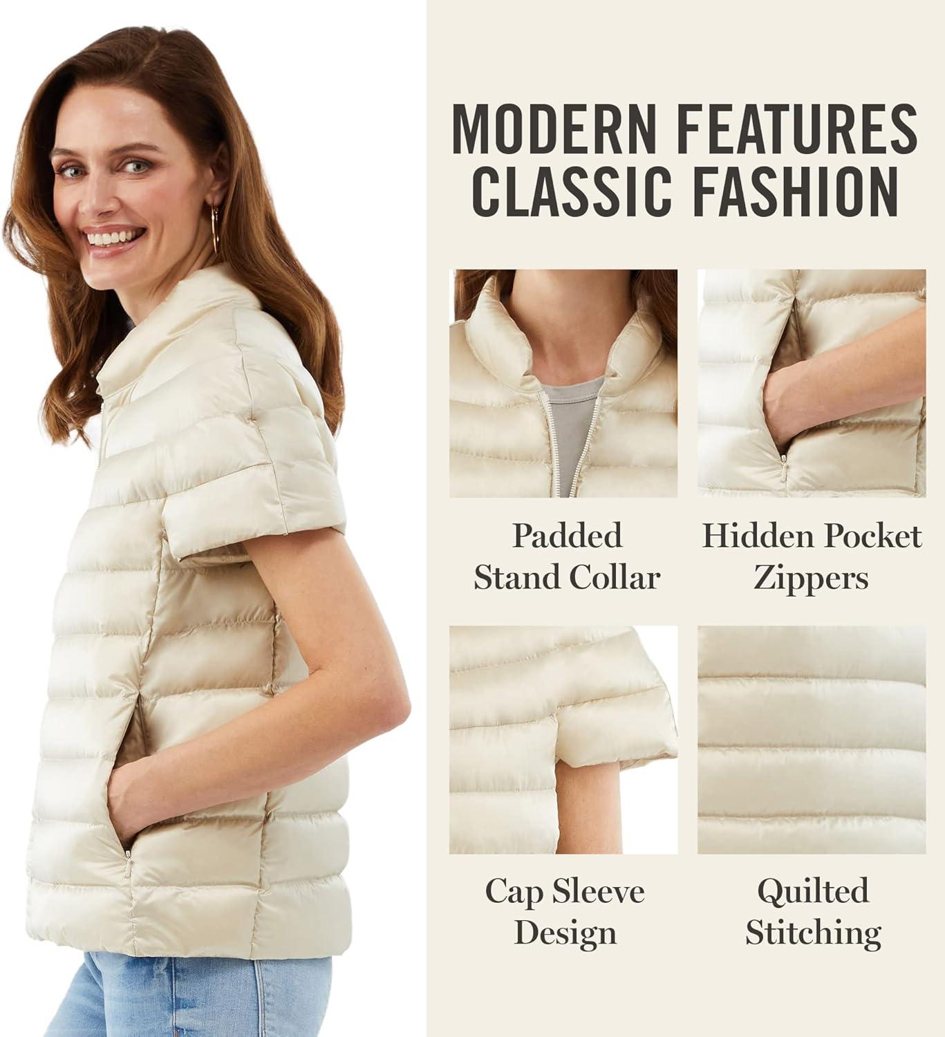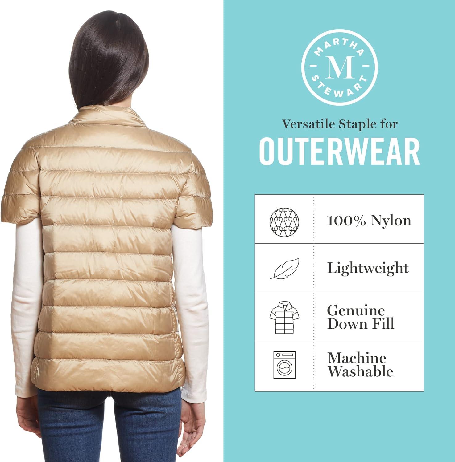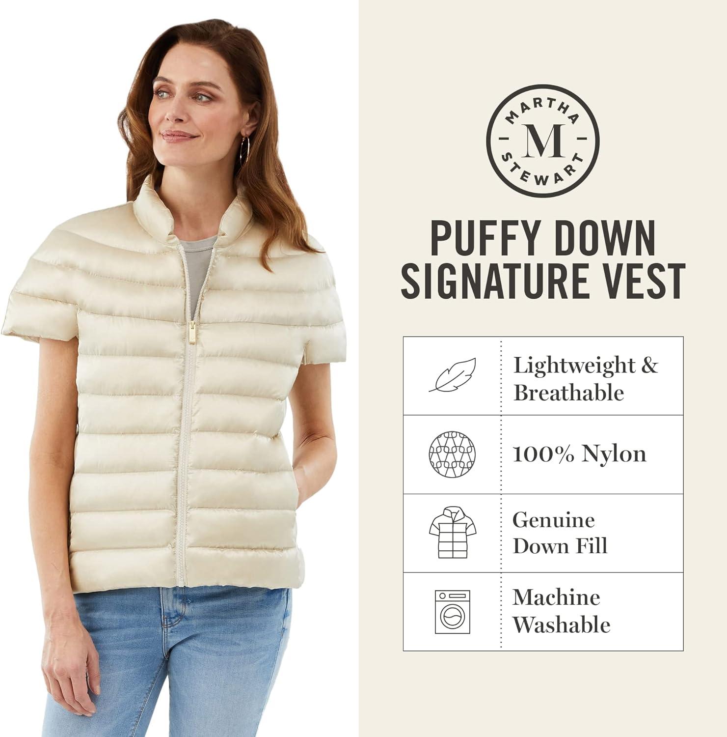Martha Stewart Women’s Quilted Down Puffer Vest, Lightweight Short Sleeve Packable Jacket with Pockets, Warm Winter Outerwear(Oat)