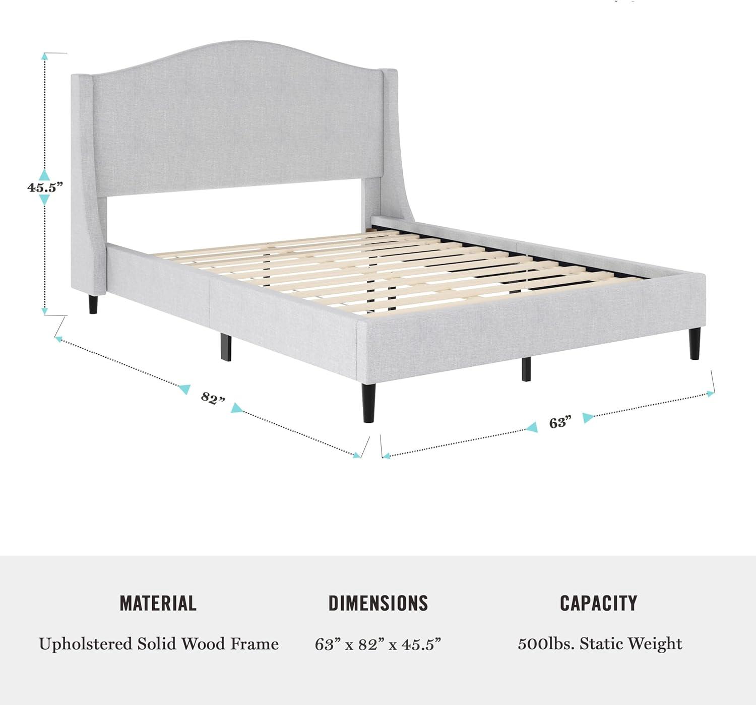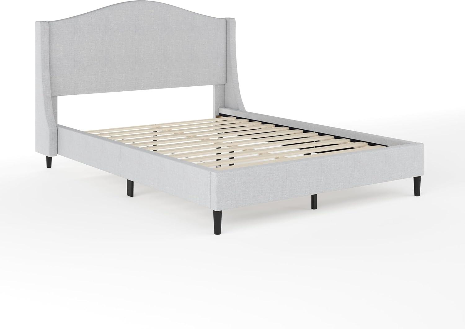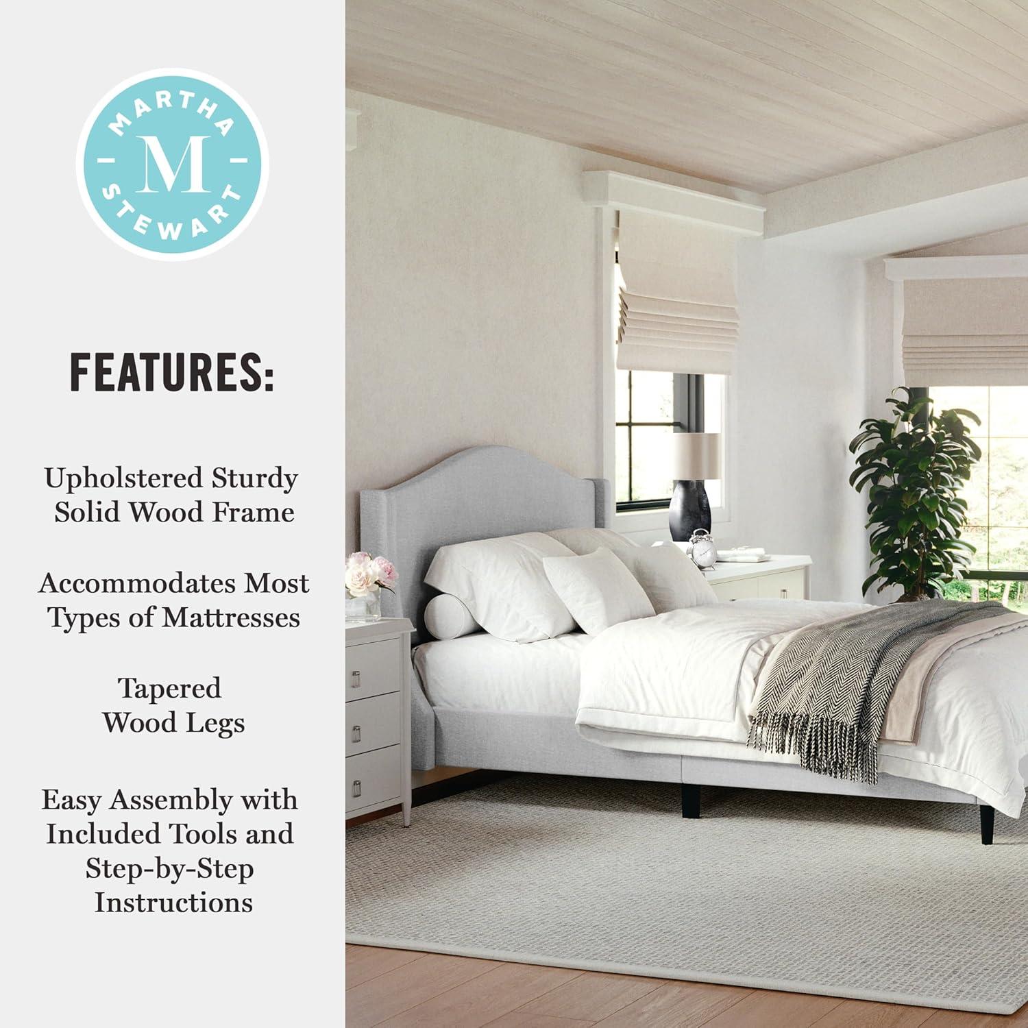 Martha Stewart Amelia Platform Bed with Curved Headboard and Cushioned Side Rails, Faux Linen Upholstery, Wood Slat Foundation, No Box Spring Needed, Queen, Beige(Gray Fabric/Black Legs)