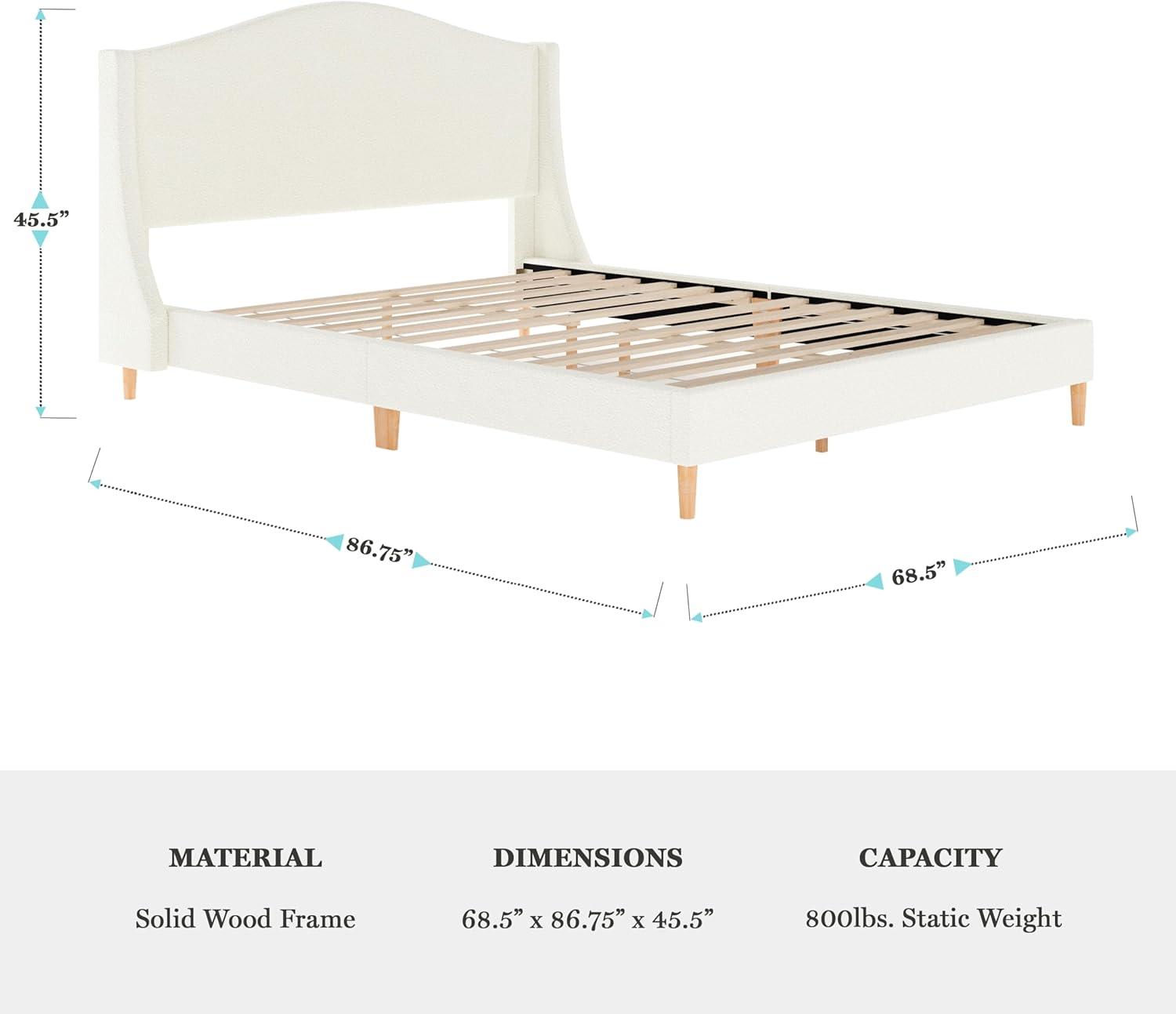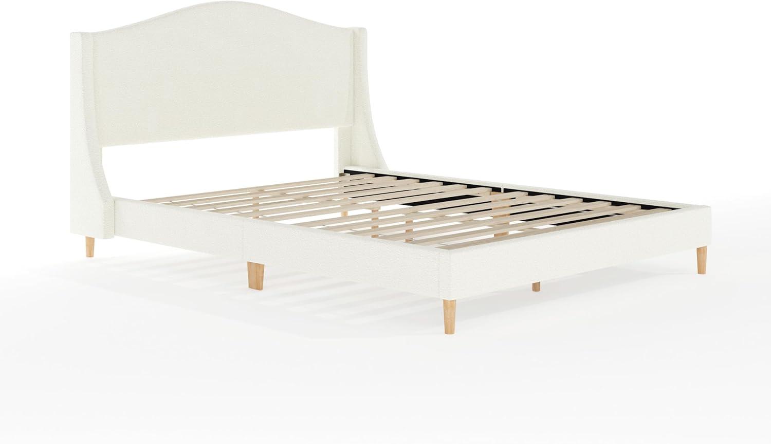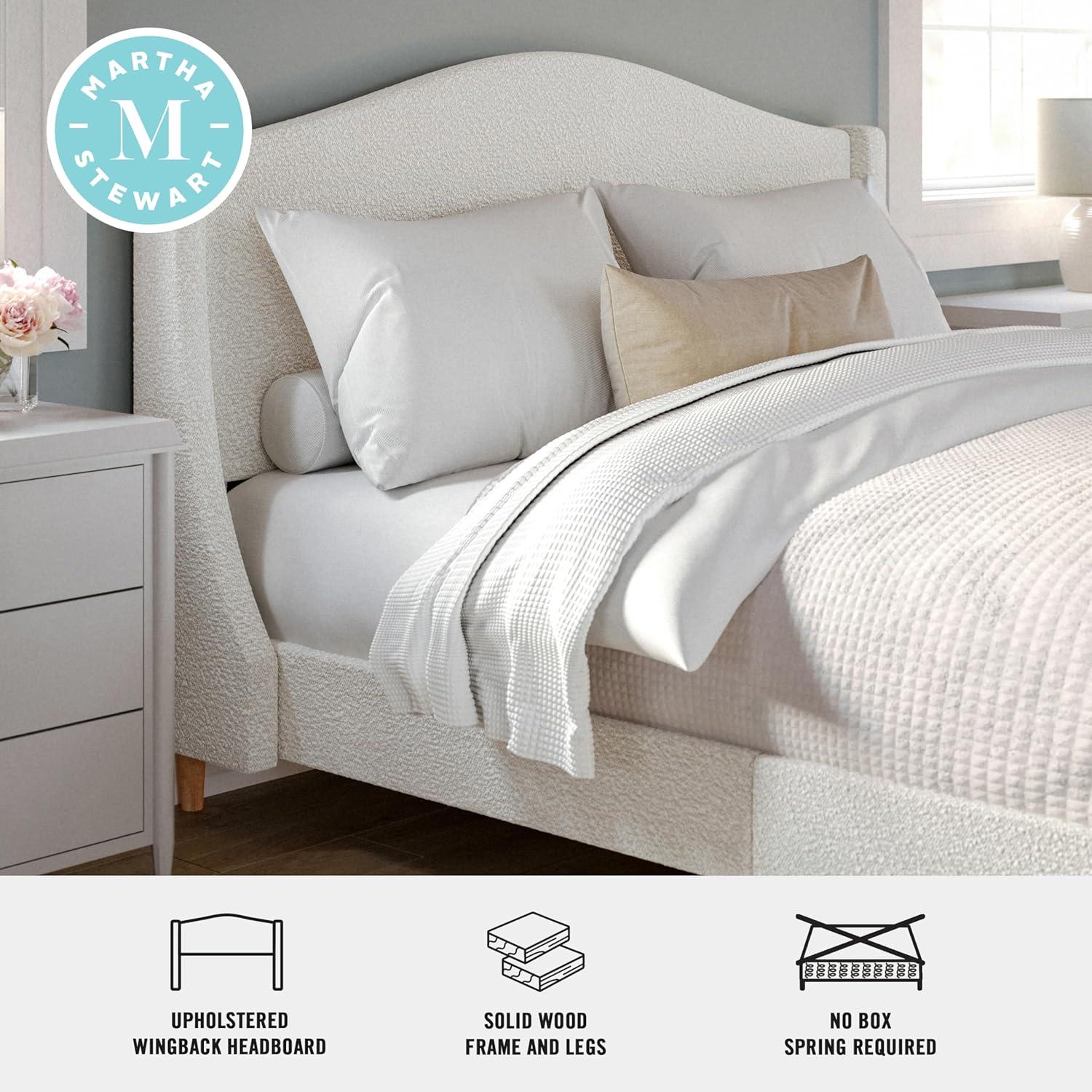 Martha Stewart Amelia Platform Bed with Curved Headboard and Cushioned Side Rails, Faux Linen Upholstery, Wood Slat Foundation, No Box Spring Needed, Queen, Beige(Off-white Boucle/Light Beech Legs)