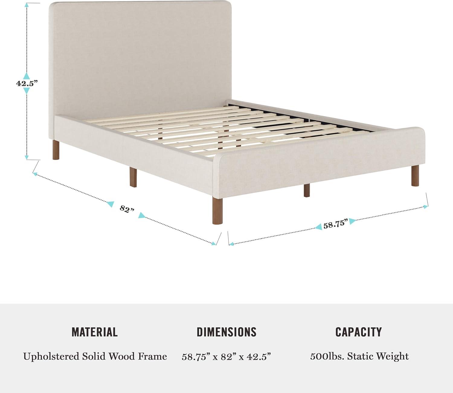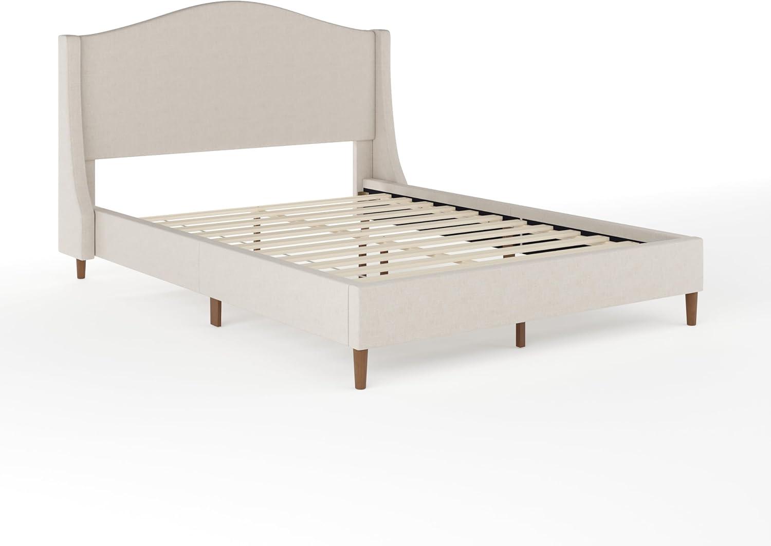 Martha Stewart Amelia Platform Bed with Curved Headboard and Cushioned Side Rails, Faux Linen Upholstery, Wood Slat Foundation, No Box Spring Needed, Queen, Beige(Beige Fabric/Walnut Legs)
